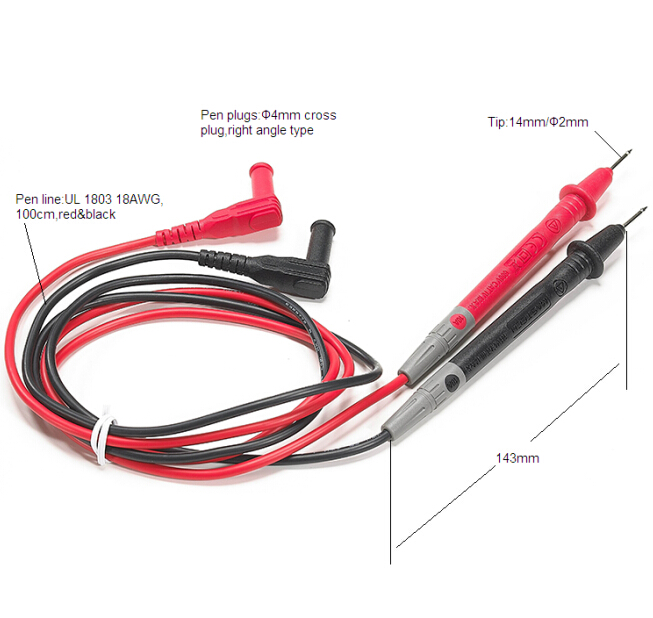 Technical parameters: Body length: 143 mm / DIM10.5 mm Tip: 14 mm/DIM 2 mm Pen plugs: DIM 4 mm cross plug, right Angle type Pen line: UL 1803 18 AWG, Length: 100 cm, red & black Security level: 1 KV CAT CAT III 600 V IV Max: 10A.
