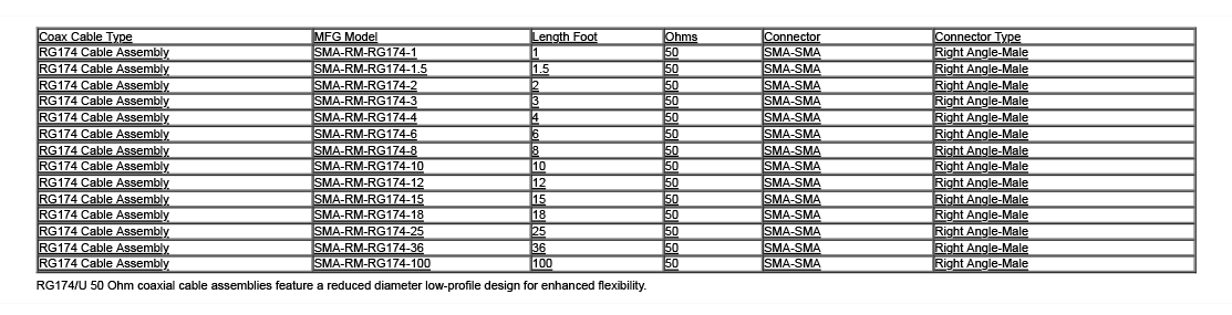 RG174/U 50 Ohm coaxial cable assemblies feature a reduced diameter low-profile design for enhanced flexibility.