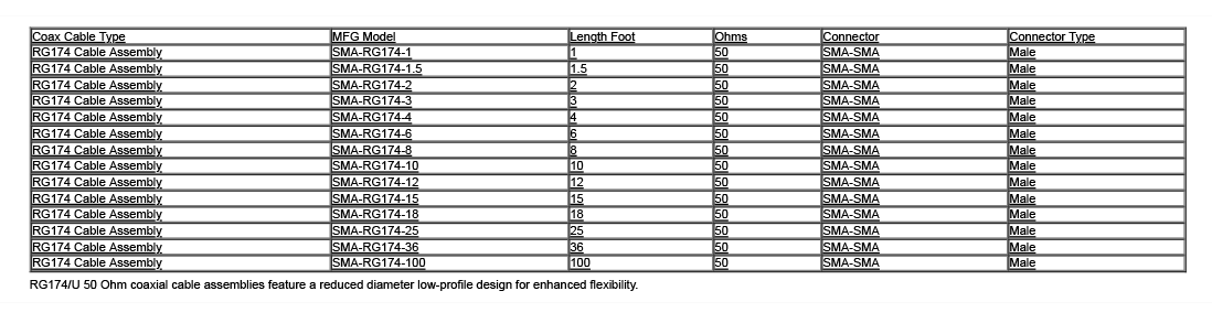 RG174/U 50 Ohm coaxial cable assemblies feature a reduced diameter low-profile design for enhanced flexibility.