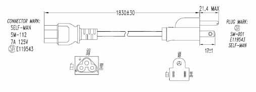 KYSAN SKU: 1112316 MFG: SM001+SM112 Mickey mouse power cord 3-Wire 6 foot (1830 mm) 7A@125VAC Black SVT 18AWG*3C 60° C VW-1 RoHS UL/CSA