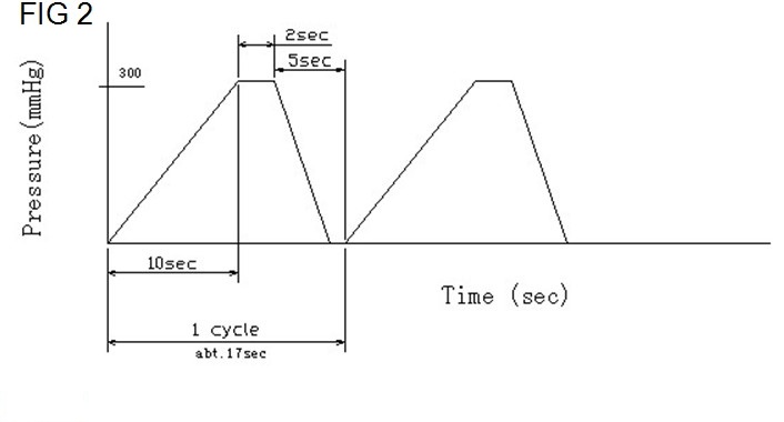 在100CC容器中,充氣10秒 停2秒 排氣5秒(FIG2)為一迴圈 測試30,000次以後按 3.3 3.4 3.5 3.6 3.7 3.8 3.9測試無異常。